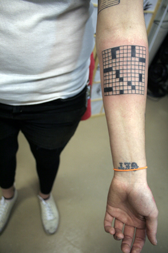 This one is probably my favorite. (Except for the Connect-the-Dots giraffe tattoo I found while searching.) I love the idea that lurking just beneath the surface is a puzzle fiend, easily recognized by all and sundry. =)