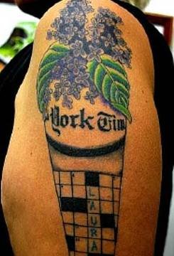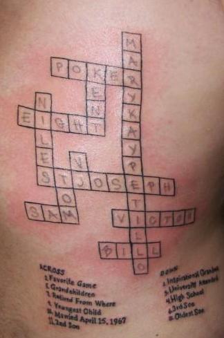 A lot of crossword-style tattoos I discovered involve answers with a personal connection: the names of children, family members, hobbies, accomplishments, etc.