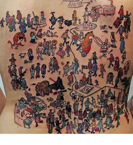 (Yes, that’s a tattoo of a Where’s Waldo? scene.)
