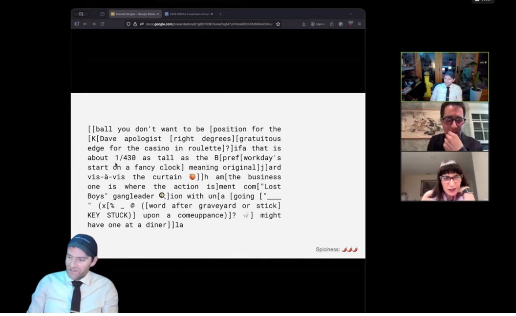 Rich’s intro was delightful, particularly when he shared that over $15,000 had been raised for the Trevor Project through the ORCAS puzzle packet!