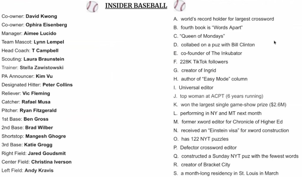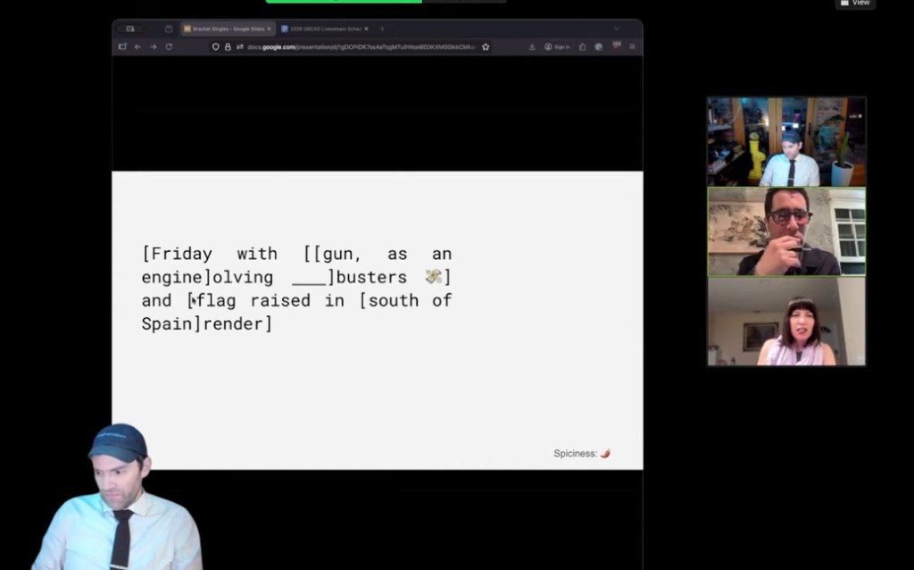With 97 people in attendance — including many nominees and puzzle luminaries in the chat — the first award was preceded by a tough trivia puzzle celebrating all of this year’s presenters: