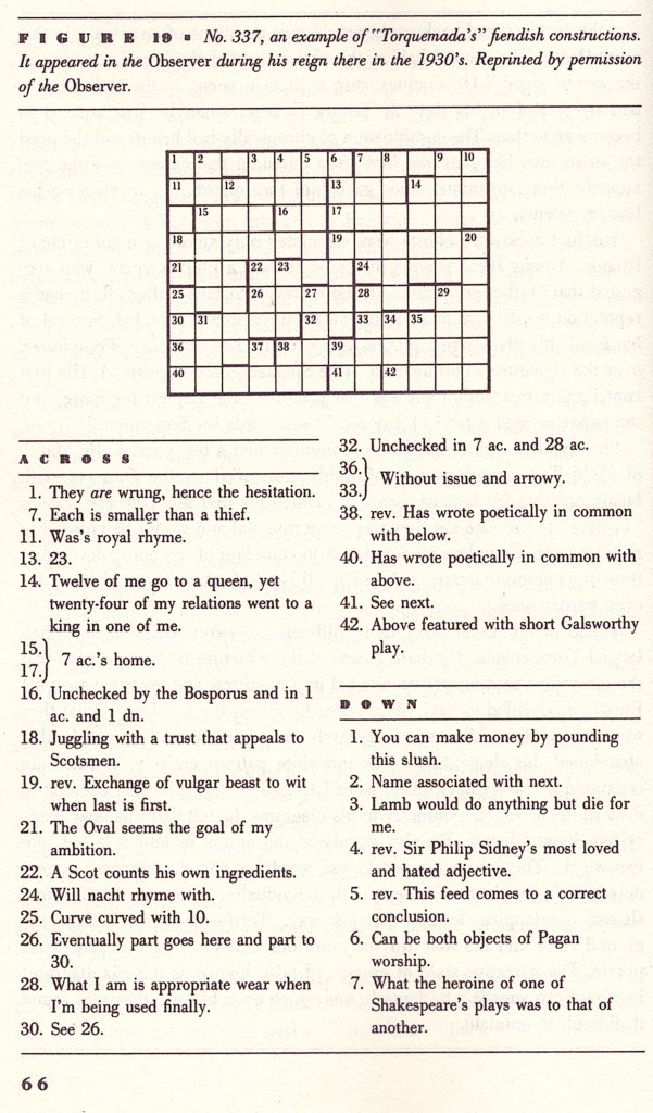 I recall how thrilling the green poster looked: “Crosswords for Supermen.” Alas, your tired commuter of today would swallow that first puzzle, verse and all, and correctly disgorge it between Charing Cross and Waterloo. — Torquemada, 1935