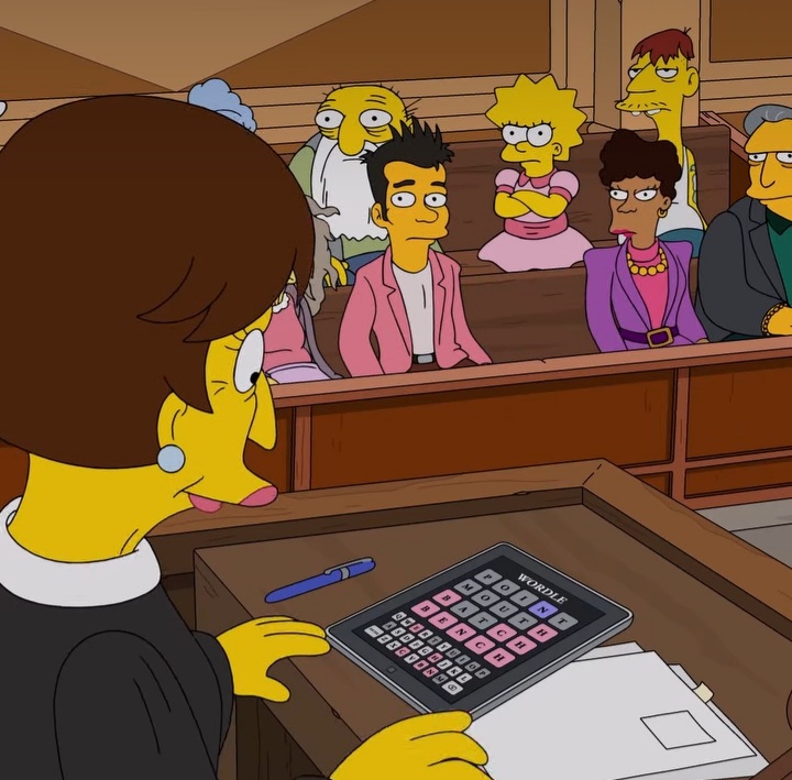 A few seasons earlier — episode 2 of season 34, entitled “One Angry Lisa” — Lisa finds herself on a jury, and is annoyed when she spots Judge Constance Harm playing Wordle during court.