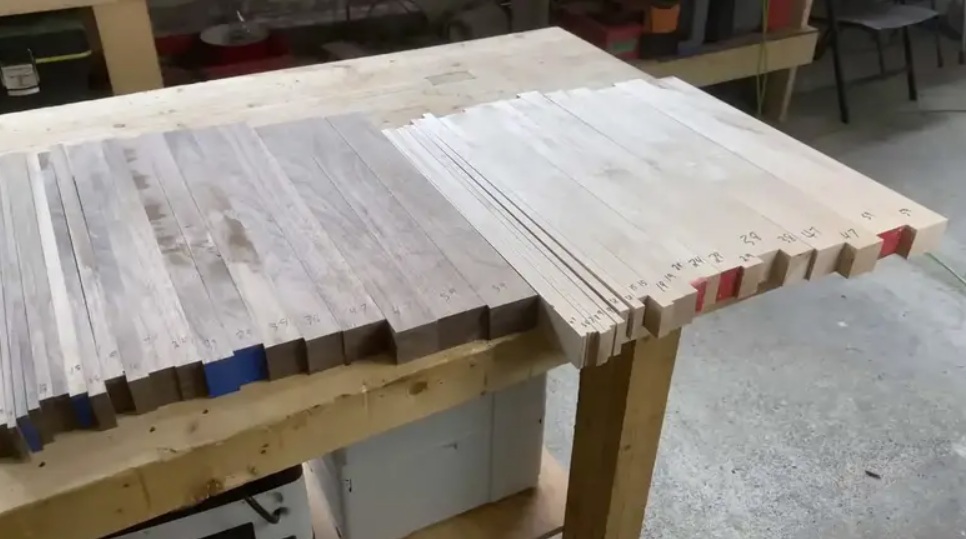 This is the optical illusion cutting board in its embryonic stage, a lineup of different pieces and thicknesses of wood. All marked and cut with precision, waiting for the next step in assembly. I stare at this picture, and consider every mark, every cut, every spin of the table saw’s blade as the creator runs piece after piece after piece through those whirling metal teeth, each of them perfect and crisp.