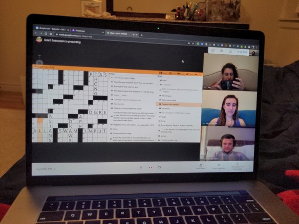 I have been submitting puzzles to the Crosswords Club and Daily POP for a while, so Patti was familiar with me and my work. In February, I had made a puzzle for the Boswords Winter Wondersolve, an online crossword competition. The constructors were all interviewed over Zoom, and Patti was watching. I mentioned in the interview that I’d love to be doing crossword things full time some day. About two minutes later, I had an email in my inbox from her about a potential job opportunity. Rich Norris was retiring in March, and she was looking for an assistant once she took over as editor for The LA Times. I enthusiastically said yes, and I’m so glad I did! I think we work together well and make a great team.