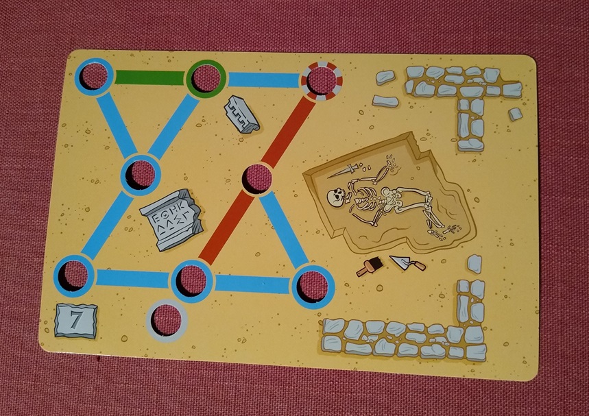 On card #1, you can see the paths available for the blue worker (who begins in the blue circle) and the lead archaeologist (who begins in the brown and gray circle). The pedestal sits in the gray circle.