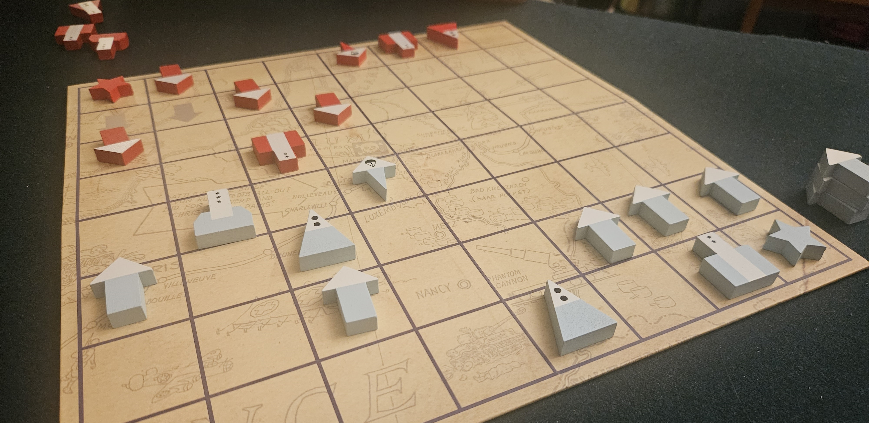 It’s also so very Vonnegut. Years before Billy Pilgrim manifested as his coping mechanism for the horrors he witnessed in the Ardennes and during the firebombing of Dresden, here he was designing a game that drew on his experience as a spotter for the 106th Infantry Division. It’s a game rooted in a particular military doctrine, one where most casualties were not inflicted by tanks or planes, but by distant cannons. While the game’s airborne units are flashy and threatening, it’s the roving fields of fire that shape this battlefield.
