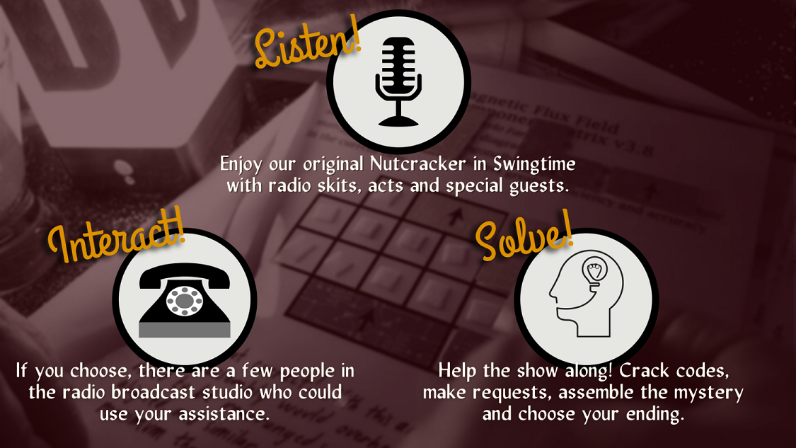The Club Drosselmeyer Radio Hour will have three parts: the Radio Show, the Drosselmeyer Industries Switchboard and the Puzzles. As a player, you can plan the ultimate holiday evening gathered around the radio and interact at whatever level you feel comfortable. There will be no video camera watching you (no Zoom!) and our Drosselmeyer Switchboard will respond to how you play. Engage with all three parts of the production, or only with some of it- however you’d like!