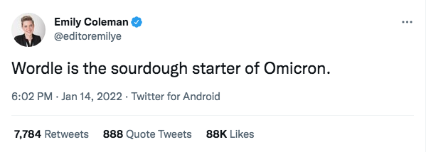A tweet by screenwriter Eden Dranger @Eden_Eats with more than 4,000 retweets and 44,000 likes places Wordle in a list of “Covid Eras” beginning with the Netflix documentary series Tiger King. Both have been pandemic sensations, topics of memes and group-chat conversations alike, but this shift from Tiger King to Wordle, taking Sarah’s theory into account, indicates that maybe we are seeing an overall shift from a passion for the bingeable to a passion for the serialized. At a time when so many of us are burned out for larger, heavier reasons than a pop culture trend, do we really need to be inviting more of that exhaustion into our brains?