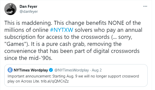 I’m not sure how many solvers use Across Lite — there are millions of daily solvers of the Times crossword — but the online reaction has been fairly negative. Both Crossword Twitter and r/crossword feature numerous posts from disillusioned solvers, including Dan Feyer, multiple-time ACPT winner, who considers this little more than a cash grab by the NYT. (He has gone on to explain his point in greater detail in further tweets.)