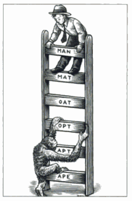 I’m a sucker for ladder puzzles, so when Mary Lou Guizzo and Jeff Chen snuck one into their May 5th puzzle in The Chronicle of Higher EducationAPE, APT, OPT, OAT, MAT, MAN — and an evolutionary one at that, I very much enjoyed it. The cluing only added to the fun, with clues like “Member of a Latin lover’s trio?” for AMAT and “Kiddie or chick follower” for LIT.