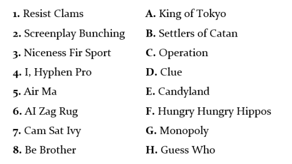 The challenge was to unscramble the names of famous board game characters from the entries on the left, and then match them up with the correct board game from the list on the right.