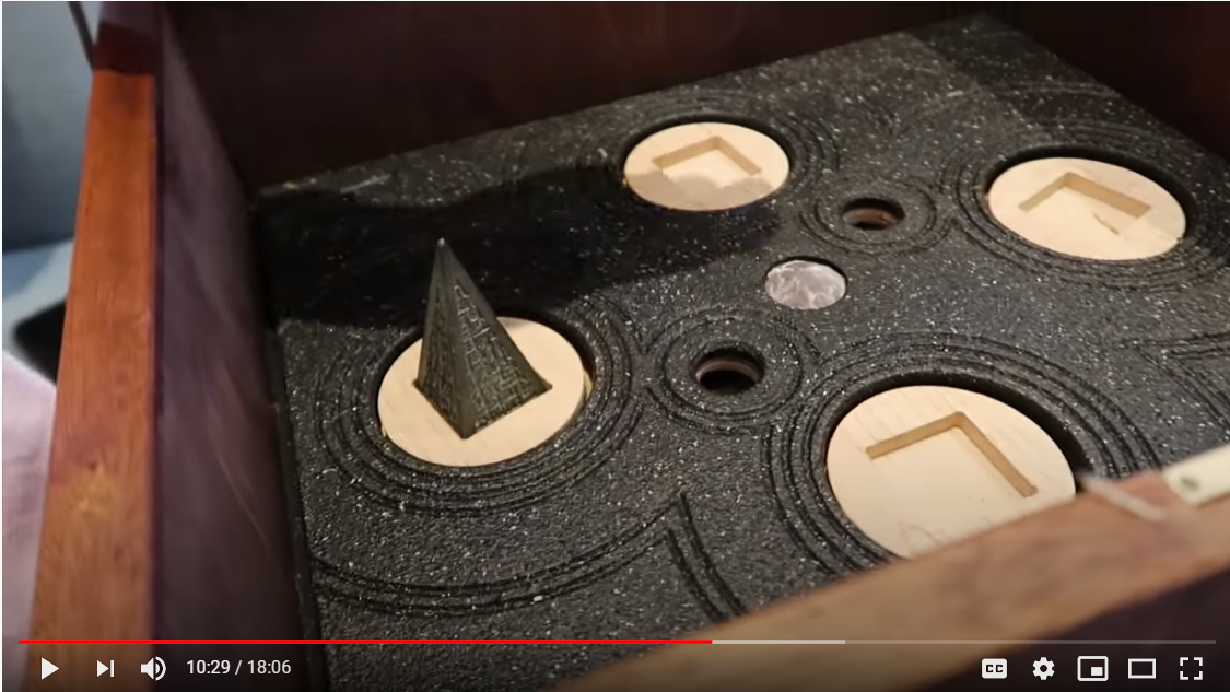 Inside the main box, below the two smaller treasure boxes, was an elaborate panel with four dials and two holes. The trick was to place the pyramids in the correct spaces, turn them a certain way, and lift the panel to reveal the treasure. This required a bit of trial and error, but the dynamic duo would not be denied.