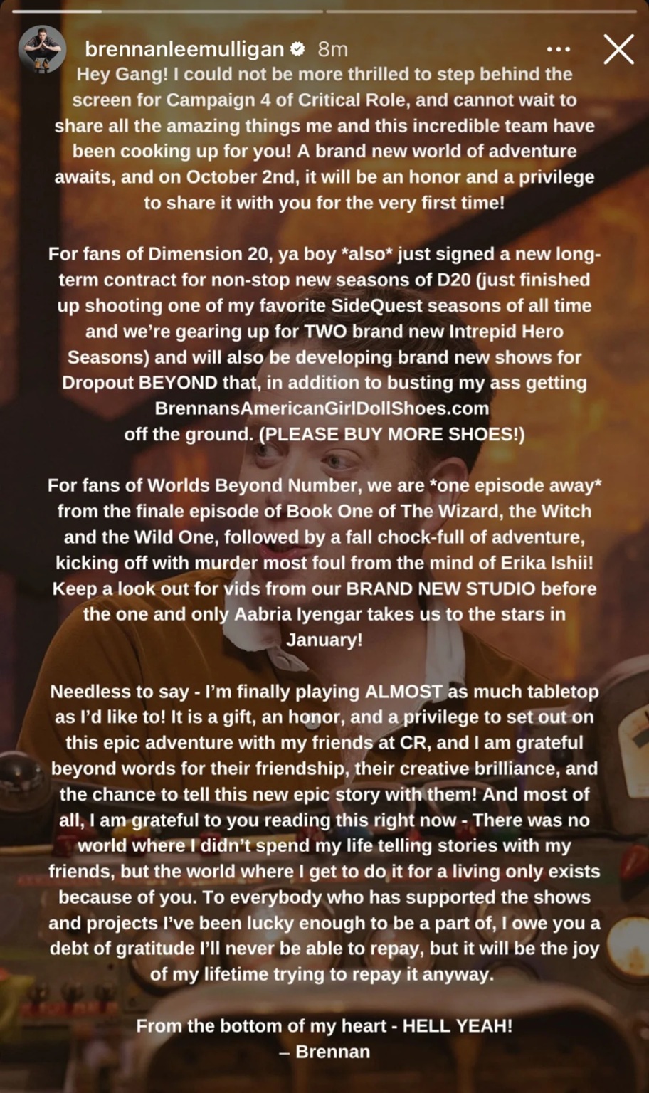 Despite signing on for a potentially years-long storytelling adventure with the Critical Role team, Brennan claims that his GM work at Dropout will NOT be slowing down.