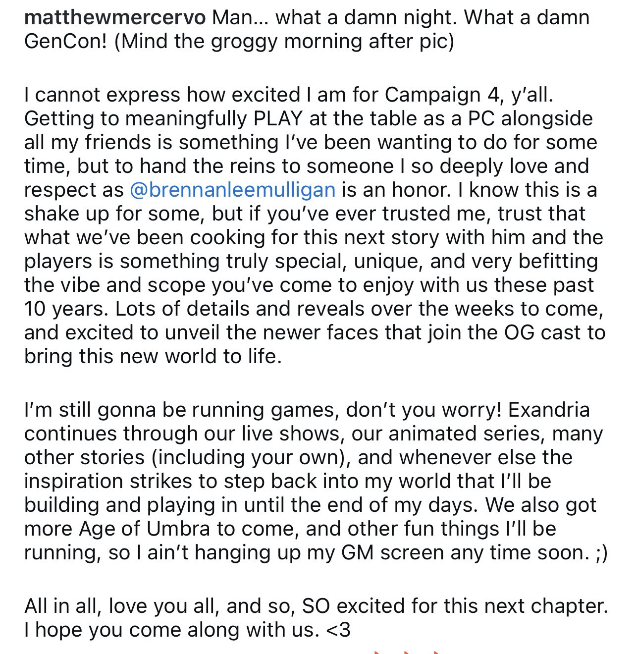 Brennan Lee Mulligan will be shepherding the Critical Role crew through Campaign 4, and Matt Mercer will finally get to step out from behind the GM screen and play a long-term PC on his own show.