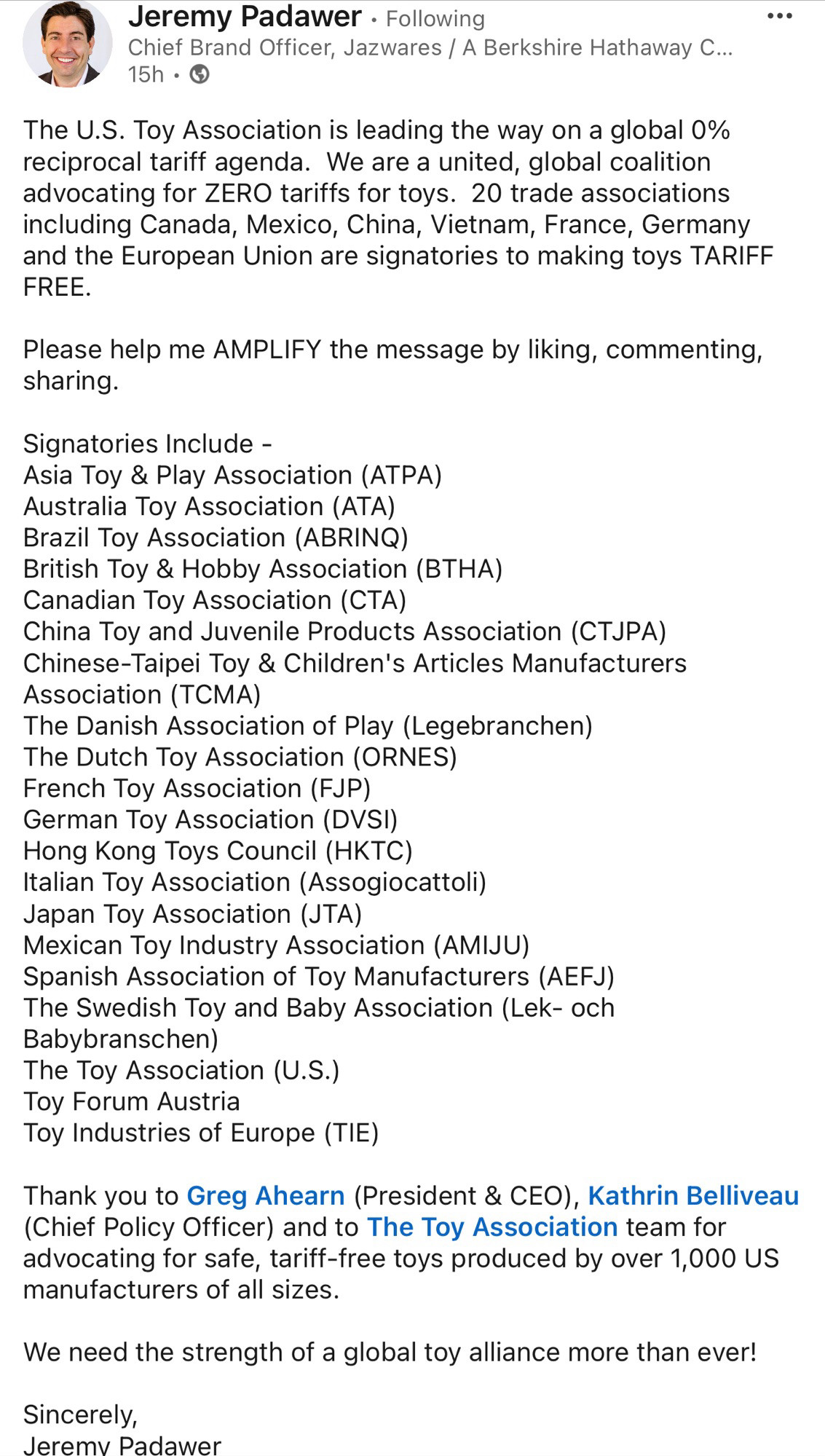 The U.S. Toy Association (founded over a hundred years ago!) is trying to forge a coalition with toy and trade associations across the world with the lofty goal of a global 0% reciprocal tariff on toys.