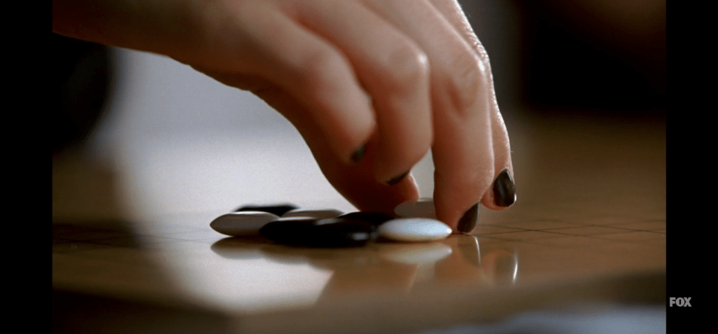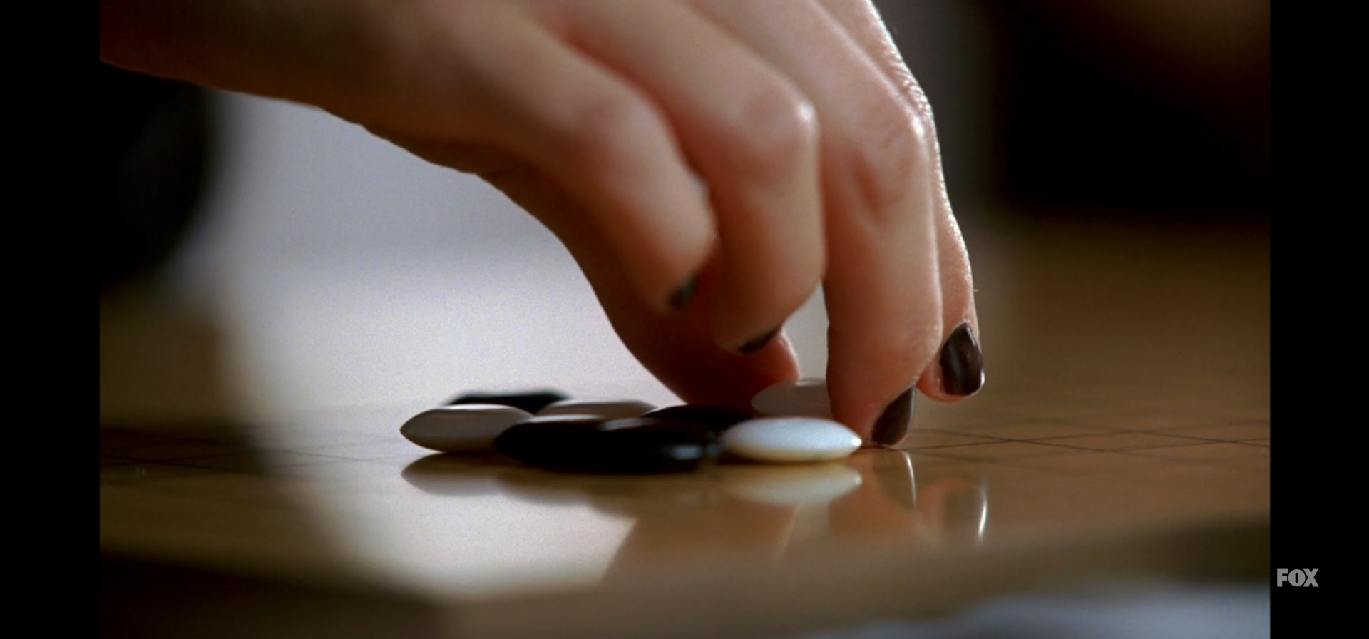 Dressed up in their best wealthy-investor chic, Sarah and Cameron meet with father-and-son team Alex (Eric Steinberg) and Xander (Eddie Shin) Akagi of Dakara Systems. Probing for connections to The Turk, Cameron poses a crucial question to Xander while Sarah and Alex grab coffee: “Do you like chess?” Later, when Sarah asks her what all of the evidence is adding up to, Cameron says, “Not The Turk. Xander doesn’t play chess. He prefers Go.” She pulls out a folding wooden board inscribed with a grid. “Xander said it’s been calculated that there are more possible Go games than atoms in the universe,” she continues, laying out black-and-white discs in the board’s center. “He’s offered to teach me how to play.”